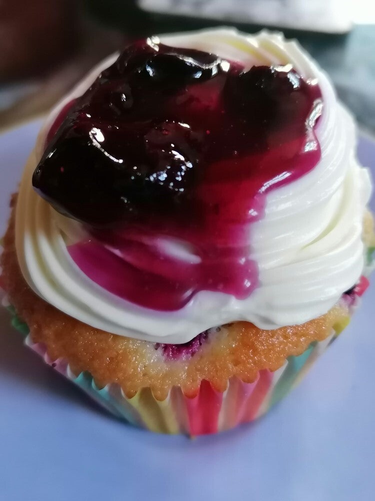 Heerlijke blauwe bessen cupcakes met als topping een witte chocoladeganache.